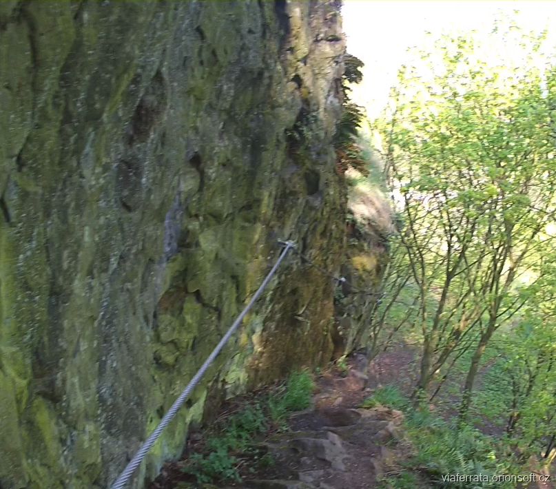 Nástup v pravé části levé stěny. Začíná vlevo od Cesty přátelství a stoupá šikmo doleva vzhůru, překřižuje Richtrovku a pak pokračuje dále vlevo vzhůru. Po šikmém traverzu na tření C strmější výstup s kramlemi C. Cesta přejde v hlinitou pěšinku a obtáčíme skálu zleva. Následuje špinavý komínek B, který nás vyvede na sestupové skalisko. Překročíme na skalku vpravo a po ní dále dozadu. Zde hlinitý balkonek, ze kterého cesta pokračuje vpravo komínkem vzhůru C/D. Skála zde klouže, ale lze najít i přírodní chyty, které dobře pomohou. Výše pak lehce zahliněnou skálou výše až na konec cesty.