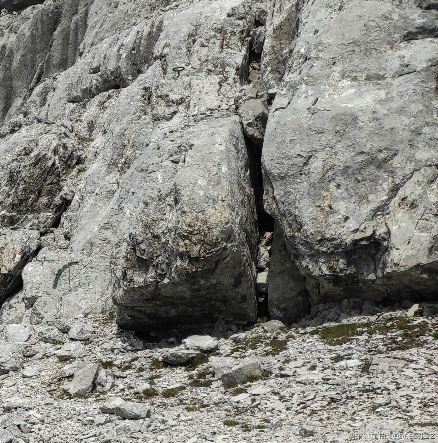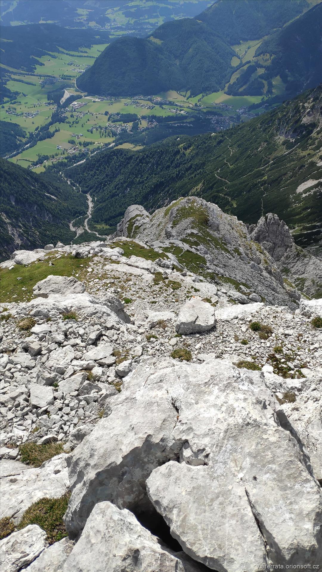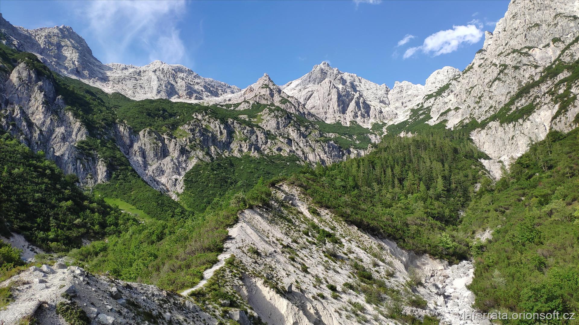 počátek kletttersteigu další pokračování další skalní práh pohled na dolní část "hřebínku" s klettersteigem shora pohled údolím vzhůru první další skalní práh |