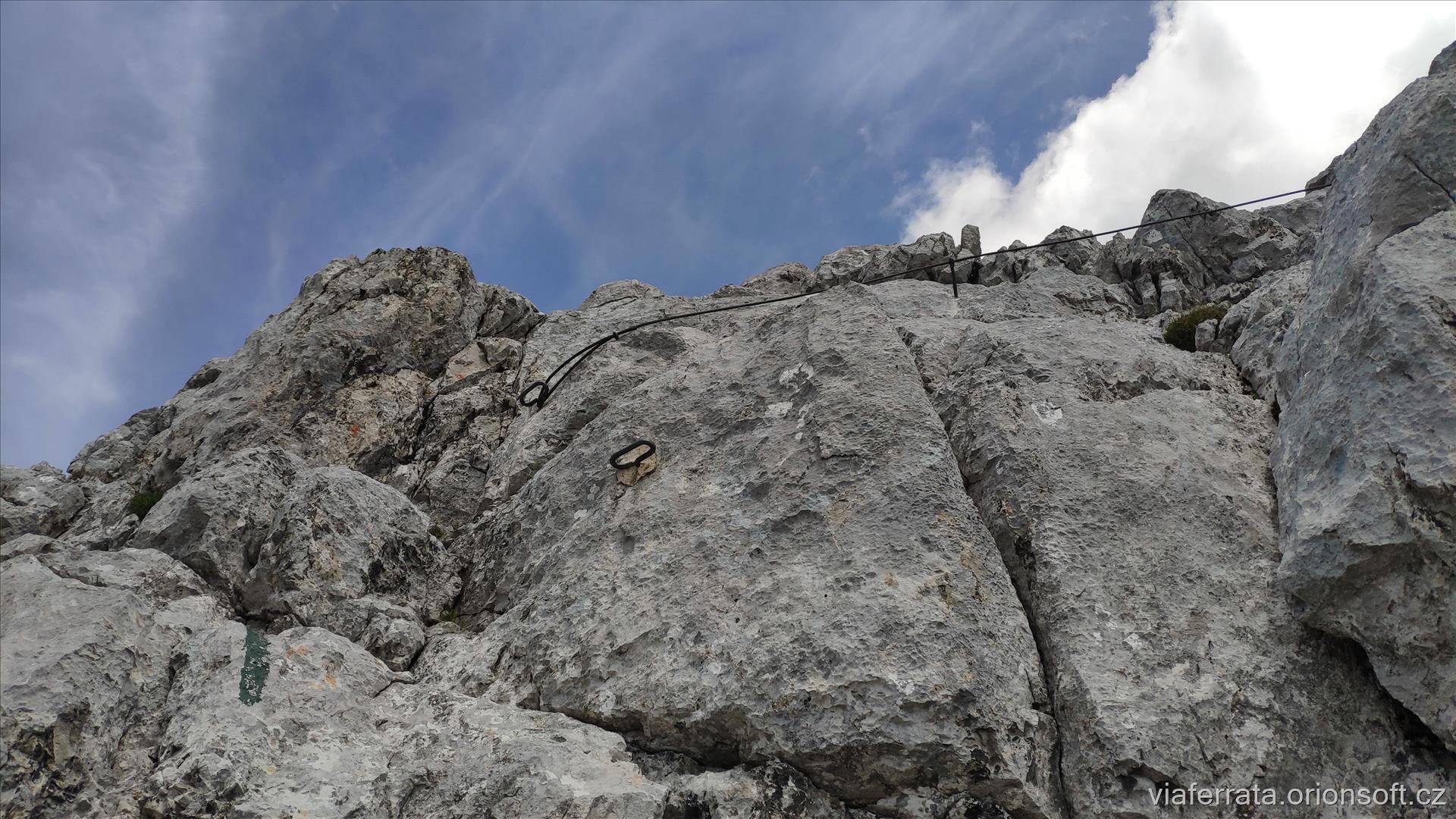 Klettersteig několikrát křižuje červeně značenou cestu a stoupá více méně stále ve směru hřebínku. V závěru se obtížnost zvyšuje na B/C.