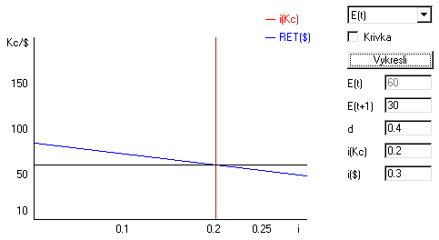 Ukázka číslo 5: Pokud by uživatele například zajímalo, jak by se musela změnit domácí úroková míra iKč aby se zachoval stejný směnný kurz při změně očekávání směnného kurzu, je možné nastavit v modelu vypočítávání právě domácí úrokové míry (v "pull-down" menu) a nastavit nový (v této ukázce snížený) očekávaný devizový kurz. Při stejném směnném kurzu (Et=125), rizikovosti země (d=0,5) i dolarové úrokové míry (i$=0,2) došlo ke snížení očekávaného směnného kurzu Et+1 na 40. Aby se směnný kurz Et zachoval, je nutné snížit domácí úrokovou míru na 12 %.